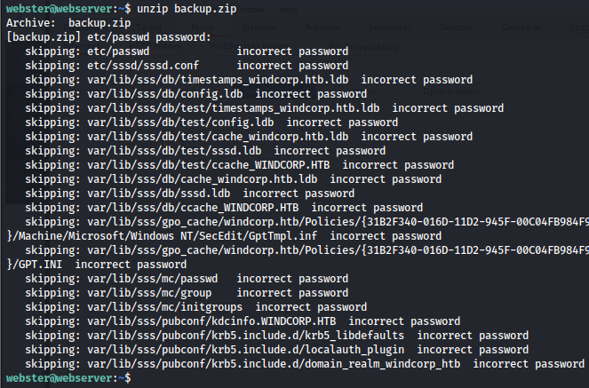 I found that backup.zip interesting,But when attempting to unzip it, we noticed that the file is password-protected and contains the /etc/passwd file. Additionally, there are numerous other files related to Active Directory, including GPOs and Kerberos configurations.