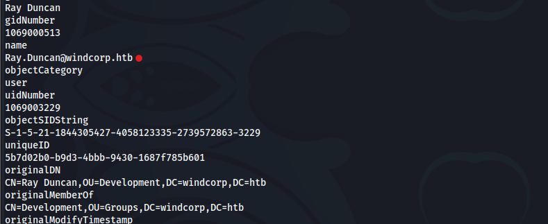 dn: CN=Ray Duncan,OU=Development,DC=windcorp,DC=htb