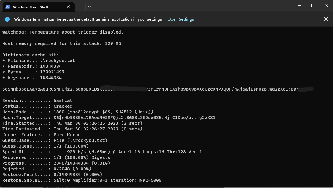 .\hashcat.exe -m 1800 .\hash.txt .\rockyou.txt`