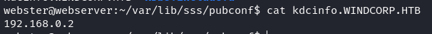The KDC (and therefore DC) of this machine was found to be at 192.168.0.2. The other database files contained references to a domain called hope.windcorp.htb