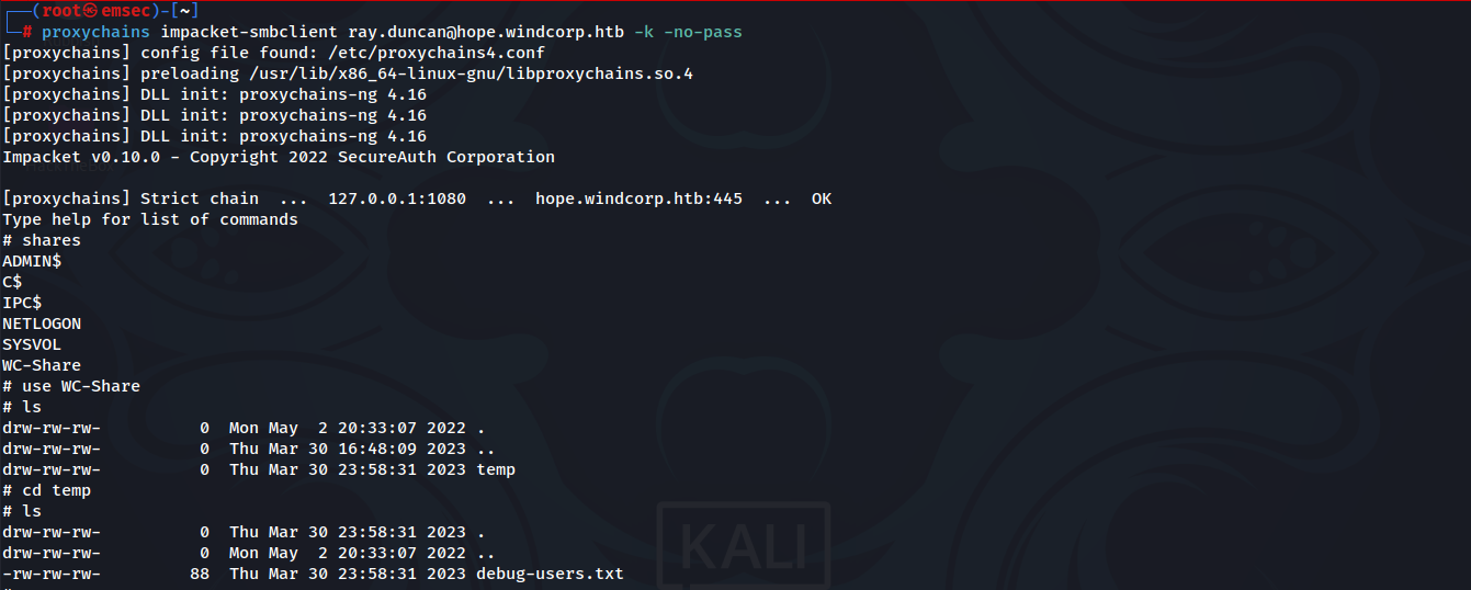 proxychains impacket-smbclient ray.duncan@hope.windcorp.htb -k -no-pass