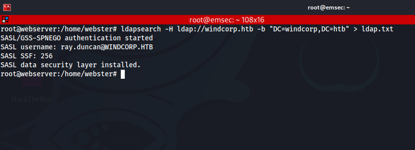 I was stuck here for a while because I was trying to log in to SSH with just “ray.duncan”, but then I realized that we need to log in with the domain name, like this: “ray.duncan@windcorp.htb” (yes, that’s his username)