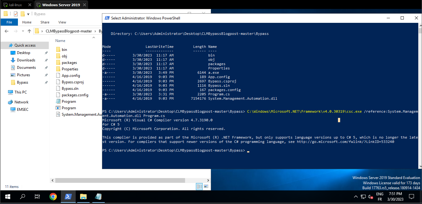 put the CLMBypassBlogpost repository on your Windows VM ,and Within the code of Program.cs, I changed the command executed to download Invoke-PowerShellTcp from our machine.