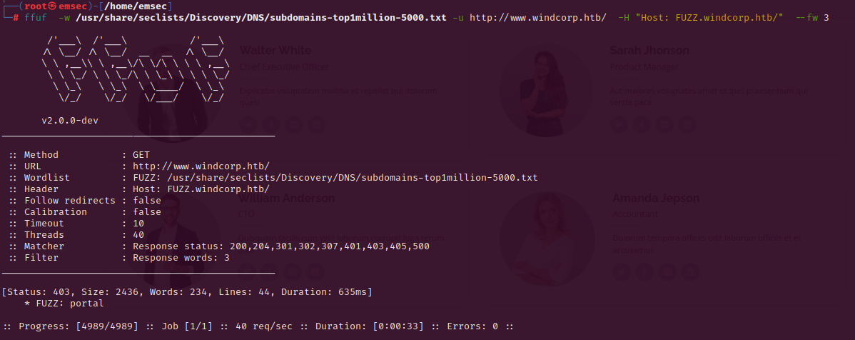 I started fuzzing with gobuster and wfuzz because this website possibly contains other subdomains, and I was able to find one at portal.windcorp.htb.