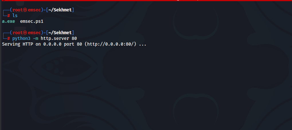We transferred the program.exe to our attacker machine and changed its name to a.exe to ignore any character limitations. If you have Python 3 installed on your Windows virtual machine, you can start a web server with the following command: