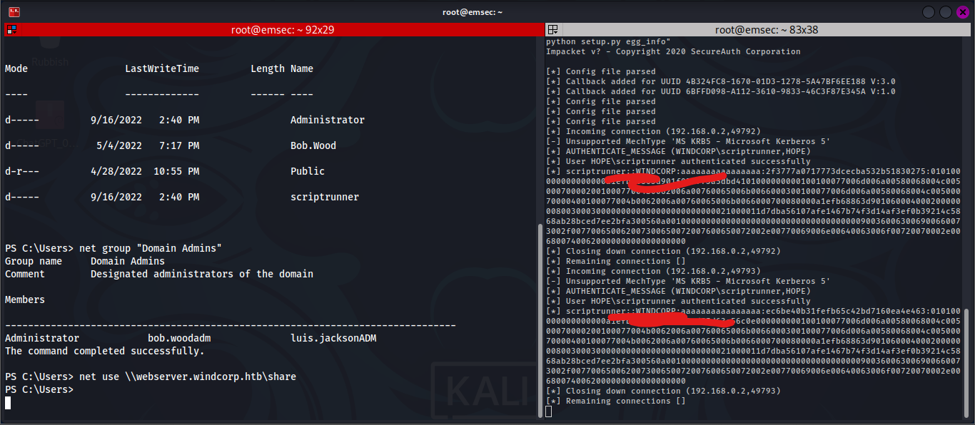 For some reason, it wouldn’t let me authenticate to my own SMB server from the DC. To circumvent this, we can head to the compromised webserver container and run smbserver there.