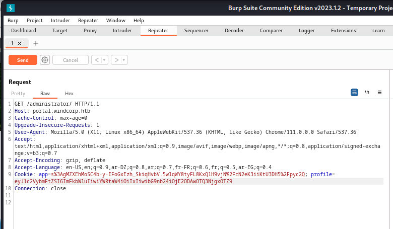 I didn’t find anything interesting on this page. Therefore, I decided to use Burp Suite to inspect the background activity. As I proxied the traffic, I stumbled upon an intriguing cookie.